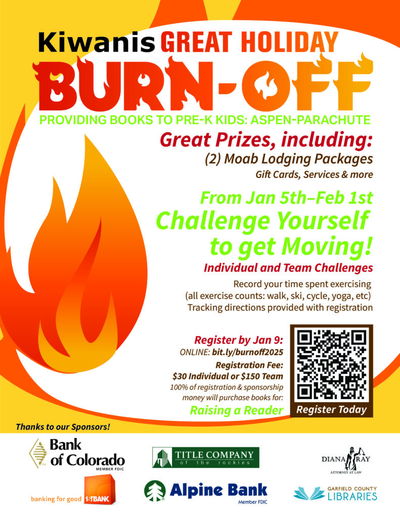 The Great Holiday Burn-Off is Glenwood Springs Kiwanis’ annual active movement virtual challenge to support programs for kids in our communities. This year funds will purchase books to be distributed in partnership with Early Literacy program Raising A Reader. This outstanding nonprofit provides books and literacy experiences to pre-K kids from Aspen to Parachute. All registration fees will be used to purchase books for free distribution to Pre-K kids.